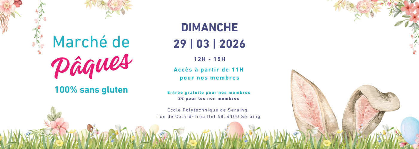 - Prochain marché sans gluten le dimanche 29/03 à Seraing !Bloquez déjà la date dans vos agendas. Plus d’informations suivront très bientôt !